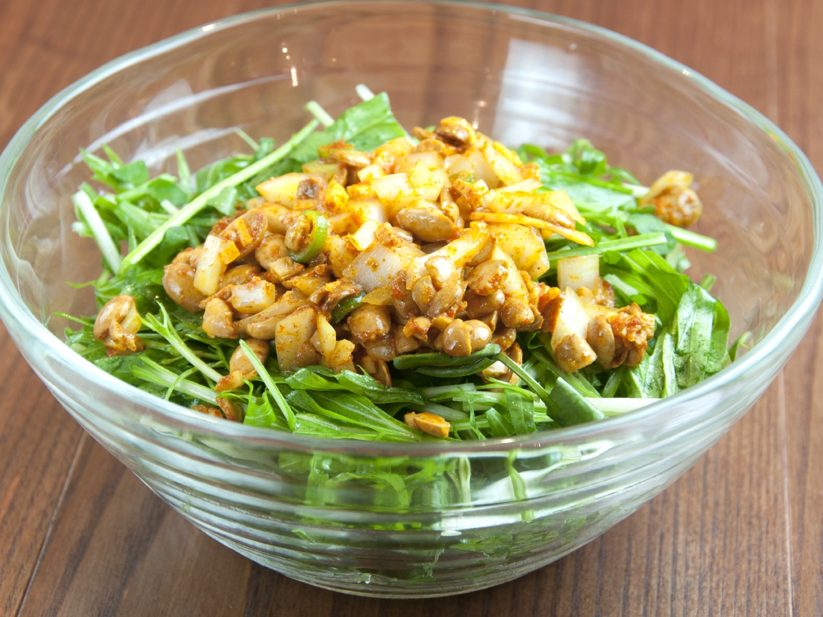 ピリ辛煎り豆とクレソン セルバチコのサラダ(レモンオリーブドレッシング) 800円 |